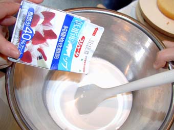 生クリーム200gにグラニュー糖18gを入れてこっちはバニラエッセンス適量を加え混ぜます。 無いときはオイルでもOKよ、そのときはほんの2〜3滴です 。