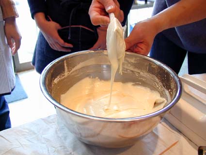 こんな状態になるまで、たった20回で混ぜる、その後、同一のカップに入れて湯煎して溶かした 牛乳30CCとムエンバター20g( あら熱を取っておく)入れて、今度はサクッっと混ぜる。ちょっと混ざりにくいけど、ちゃんとすばやく混ぜる。